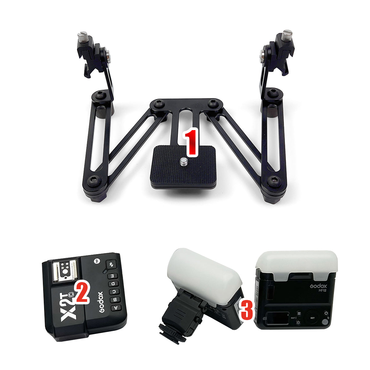 You can order the MK-020 Bracket alone if you already have suitable flashes for your camera or you can get the Kit which includes MK-020 Adjustable Bracket with Godox X2T Flash Triger and two Godox MF12 Flashes.